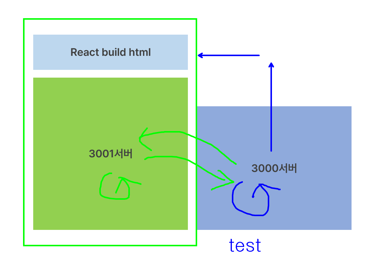 화면을 구성하는 React와 서버인 Node를 연결할 때의 구성을 그림으로 표현한 것이다. (그림 1) 기존의 Node.js에서는 templete engine(템플릿 엔진)으로 화면에 보일 엔진을 선택하였는데, React와 연결할 거니까 자연스럽게 React가 템플릿 엔진의 역할을 하게 된다.