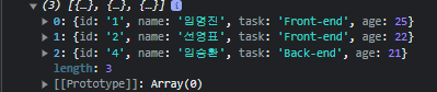 filter 함수의 결과이다. 코드 블럭에서는 age_27 배열의 결과이다. map 함수의 결과(그림 2)와는 다르게 새로운 배열의 요소가 true, false가 아닌 원래 형태인 객체 형태로 나온다. 그리고 조건의 결과가 false로 나오는 요소들은 새로운 배열에 포함되지 않는다. 이것들이 map함수와 filter함수와의 차이점이다.