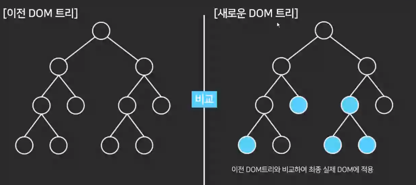 기존 DOM에서는 새로운 데이터가 업데이트되면 렌더링 과정이 처음부터 다시 실행되서 성능이 저하되는 현상이 있다.