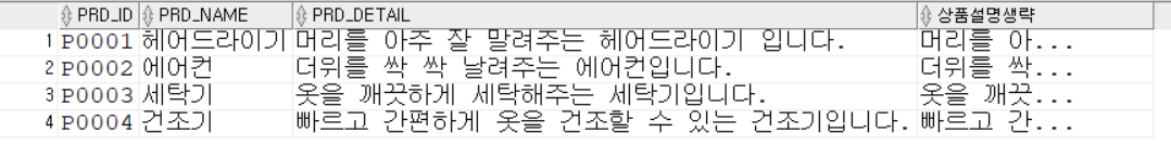 , SUBSTR(PRD_DETAIL, 1, 5) || '...' AS 상품설명생략 -- 문자열 잘라내기 (문자열, 시작위치, 시작위치부터 개수)