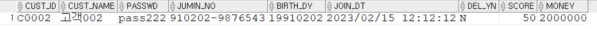 WHERE에서 CUST_NAEM이 고객002인 사람만 출력하게 했으니 결과가 저렇게 나온다.